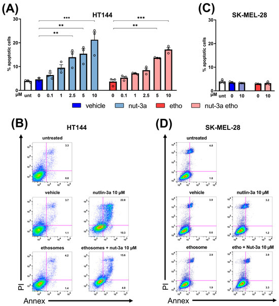 Nutlin-3a-loaded ethosomes induce apoptosis in p53wild-type melanoma cells. Percentages of apoptotic cells in HT144 expressing p53wild-type (A) and SK-MEL-28 expressing p53mut (C) cultured with nutlin-3a or nutlin-3a-loaded ethosomes with equivalent nutlin-3a concentrations after 48 h. Vehicle and empty ethosomes are reported as controls. Results are expressed as a percentage of the total population. Bars represent the mean ± SEM, and each circle denotes the value of each experimental replicate. Statistical analysis was performed by means of ANOVA followed by Bonferroni’s post hoc test. The number of asterisks indicates the relative p-value (p): **, p ≤ 0.01; ***, p ≤ 0.001. Representative flow cytometry dot plots are shown (B,D).