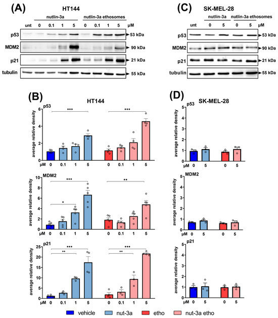 Since both the cell cycle and apoptosis are p53-dependent events, next, we evaluated the molecular effects of the inhibition of MDM2, the specific target of nutlin-3a, and a known p53 inhibitor. After treatment for 24 h with increasing concentrations of nutlin-3a or nutlin-3a-loaded ethosomes and relative controls, we analyzed the levels of p53 and of its target genes MDM2 and p21 (Figure 5). As shown in Figure 5A,B, both nutlin-3a and nutlin-3a-loaded ethosomes significantly upregulate p53 levels in HT144 cells. The specific transcriptional activity of p53 allowed a significant upregulation of its target proteins MDM2 and p21, suggesting that the loaded drug was functional and properly internalized by the cells without loss of its biological activity. Interestingly, p53 levels were significantly higher in cells exposed to 5µM nutlin-3a-loaded ethosomes than those exposed to nutlin-3a (p = 0.0009). In parallel, experiments conducted on SK-MEL-28 cells expressing a functionally inactive p53 showed that the p53 pathway was not activated and the p53, MDM2, and p21 protein levels were unaffected by treatments with nutlin-3a and nutlin-3a-loaded ethosomes (Figure 5C,D). The vehicle alone and the empty ethosomes, used as controls, did not affect the p53 pathway in both cell lines.