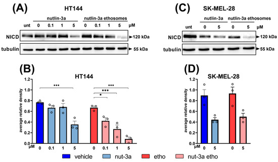 Analyses of the Western blotting results, shown in Figure 7, indicated a significant reduction in NICD levels in HT144 cells (expressing p53wild-type) after 48 h of treatment with nutlin-3a and nutlin-3a-loaded ethosomes (Figure 7A,B). Interestingly, the NICD downregulation mediated by nutlin-3a-loaded ethosomes was significantly higher than that mediated by nutlin-3a (0.1µM, p = 0.0429; 1µM, p = 0.0004; 5µM, p = 0.0202) and initiated at a low concentration (Figure 7B). An inhibitory effect can also be observed in SK-MEL-28 cells treated with nutlin-3a and nutlin-3a-loaded ethosomes, although this modulation is not significant at the tested concentrations (Figure 7C,D).