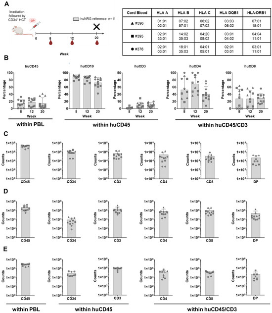 Human hematopoietic engraftment and T-cell development in humanized NRG mice used as a reference strain. (A) Scheme of experiments: CD34+ stem cell transplantation (HCT) i.v. after irradiation, blood collection (BL), and termination (X). The humanized mice were humanized with three different CB donors: #396 (depicted as a triangle), #395 (depicted as a square), and #376 (depicted as a circle). Both female and male mice were used in this experiment (details in Table S1). Created in BioRender. Lab, S. (2024) BioRender.com/x52w302. (B) Blood analyses at weeks 8, 12, and 20 after HCT and longitudinal quantification of cells expressing huCD45, huCD34, huCD19, huCD3, huCD4, and huCD8 (in percentages). (C) Bone-marrow analyses showing the quantification of cells expressing huCD45, huCD34, huCD3, huCD4, huCD8, and double positive (DP) (in absolute cell counts, log scale). (D) Thymus analyses and the quantification of cells expressing huCD45, huCD34, huCD3, huCD4, huCD8, and DP (in absolute cell counts, log scale). (E) Spleen analyses and quantification of cells expressing huCD45, huCD34, huCD3, huCD4, huCD8, and DP (in absolute cell counts, log scale).