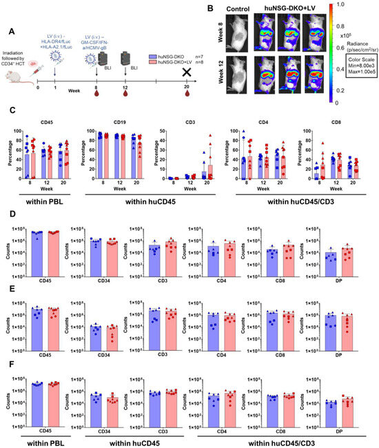 Human hematopoietic engraftment and T-cell development in humanized NSG-DKO mice. (A) Scheme of experiments: CD34+ stem-cell transplantation (HCT) i.v. after irradiation, lentivirus (LV) immunization i.v., bioluminescence imaging (BLI) analyses, blood collections (BL), and termination (X). Created in BioRender. Lab, S. (2024) BioRender.com/y83d419; (B) full-body BLI quantified as photons/second (p/s) at 8 or 12 weeks post-HCT of huNSG-DKO control (representative of one mouse) or after LV administration (representative of three mice). (C) Blood analyses at weeks 8, 12, and 20 after HCT and longitudinal quantification of cells expressing huCD45, huCD19, huCD3, huCD4, and huCD8 (in percentages). (D) Bone marrow analyses showing the quantification of cells expressing huCD45, huCD34, huCD3, huCD4, huCD8, and DP (in absolute cell counts, log scale). (E) Thymus analyses and quantification of cells expressing huCD45, huCD34, huCD3, huCD4, huCD8, and DP (in absolute cell counts, log scale). (F) Spleen analyses and quantification of cells expressing huCD45, huCD34, huCD3, huCD4, huCD8, and DP (in absolute cell counts, log scale).