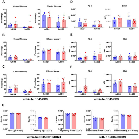 Human T-cell and B-cell maturation and activation in huNSG-DKO mice. (A) Analysis of central memory and effector memory T-cell subtypes within huCD4+ and huCD8+ T-cells in bone marrow (in percentages). (B) Analysis of central memory and effector memory T-cell subtypes within huCD4+ and huCD8+ T-cells in thymus (in percentages). (C) Analysis of central memory and effector memory T-cell subtypes within huCD4+ and huCD8+ T-cells in spleen (in percentages). (D) Analysis of T-cell activation markers PD-1 and CD69 within huCD4+ and huCD8+ T-cells in bone marrow (in absolute numbers, log scale). (E) Analysis of T-cell activation markers PD-1 and CD69 within huCD4+ and huCD8+ T-cells in thymus (in absolute numbers, log scale). (F) Analysis of T-cell activation markers PD-1 and CD69 within huCD4+ and huCD8+ T-cells in spleen (in absolute numbers, log scale). (G) Analysis of B-cell subtypes in spleens. B-cell subtypes: naïve, memory, regulatory, plasma cells, and plasmablasts (in absolute cell counts, log scale).