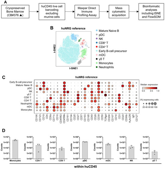 CyTOF analysis of huNRG mice as a reference. (A) Scheme of sample preparation, staining, CyTOF measurement, and analysis of bone marrow samples. The mice were humanized using only one donor (CB #376). (B) Anti-human CD45-CD live cell barcoded analysis of immune cell types in bone marrow samples 20 weeks post-HCT. A total of 152,755 cells were analyzed for huNRG mice. t-SNE plots displaying different subtypes of human immune cells clustered using FlowSOM and annotated manually using the lineage markers presented in the dot plot below. (C) Dotplot of huNRG cell subtypes and their expression of different Maxpar Direct Immune Profiling lineage markers. The dot size corresponds to the fraction of cells expressing the indicated marker within each cell type, and the color indicates the median expression. (D) CyTOF analysis of monocytes, CD4+, CD8+, and γδ T-cells, and natural killer, myeloid, and plasmacytoid dendritic cell counts in bone marrow samples (in absolute cell numbers, log scale).