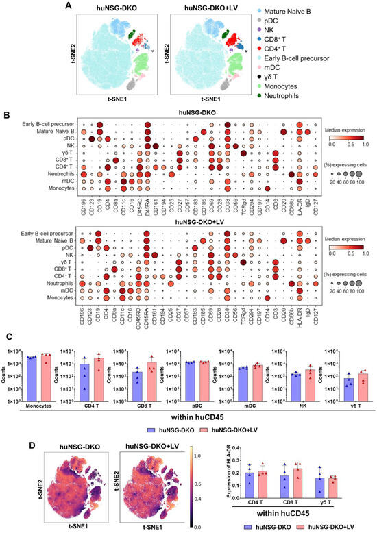 B-cells were the most dominant cell population detectable via CyTOF in huNSG-DKO or huNSG-DKO+LV mice (Figure 5A). A greater trend in the detectable total amounts of CD4+ T-cells was seen in huNSG-DKO+LV compared with huNSG-DKO (amounts of huCD4+ T-cells at week 20 in bone marrow: 999 ± 1625 in huNSG-DKO vs. 3054 ± 2708 in huNSG-DKO+LV; Figure 5C and Tables S8 and S9). Further, natural killer (NK) and γδ T-cells were detectable, but some of the huNSG-DKO mice that received LV showed outliers with much higher frequencies (amount of γδ T-cells at week 20 in bone marrow: 72 ± 77 in huNSG-DKO vs. 165 ± 147 in huNSG-DKO+LV; Figure 5C and Tables S8 and S9). Further, CyTOF identified human monocytes as an abundant population, and interestingly, with increased percentages in huNSG-DKO+LV compared with huNSG-DKO (amounts of monocytes at week 20 in bone marrow: 3543 ± 459 in huNSG-DKO vs. 4717 ± 2369 in huNSG-DKO+LV; Figure 5C and Tables S8 and S9). Notably, this was paired with higher frequencies of plasmacytoid dendritic cells (pDCs) and myeloid dendritic cells (mDCs) in huNSG-DKO+LV mice (Figure 5C; Tables S8 and S9). These results indicated stimulatory effects of the LV administration in the innate immune cells of bone marrow. Moreover, analyses of cells expressing HLA-DR showed a slight increase in CD8+ T-cells of huNSG-DKO+LV mice (HLA-DR expression on huCD8+ T-cells in bone marrow: 0.180 in huNSG-DKO vs. 0.236 in huNSG-DKO+LV; Figure 5D and Tables S8 and S9).