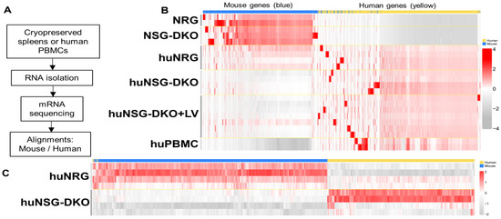 To explore additional biomarkers, we profiled the mouse/human transcriptional gene expression in humanized mice and the effects of LV delivery using bulk mRNA sequencing (Figure 6A). Since humanized mice possess genetic material from both mice and humans, the assignment of each identifiable transcript had to be assessed for the two species. For this assignment, control samples of non-humanized mice possessing only mouse genes and huPBMCs possessing only human genes were also sequenced. Since mice and humans have high genetic similarity, it was important to identify potential genes in which the aligner would erroneously assign a read to the wrong species [29]. These genes were removed from further analyses. To visualize all of the data, a heatmap was generated of all 59,314 genes analyzed across the two species, and it showed that the majority of genes were specifically assigned to the right species (Figure 6B). Control samples such as the non-humanized mouse samples showed a generally higher expression of mouse genes as compared to the other models and an extremely low value for human genes, as no expression of these genes should be observed here. As expected, mouse genes were identified near or below the detection limit in huPBMCs and human genes expressed at higher levels (Figure 6B). Similarly, several human transcripts could be identified in mRNA obtained from humanized mouse samples compared with non-humanized mice. Unexpectedly, samples obtained from the huNRG reference strain showed a higher expression of mouse genes and a lower expression of human genes, whereas this was inversed in huNSG-DKO mice (Figure 6C).
