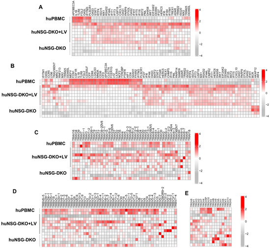 Humanized NSG-DKO mice show upregulation of several biomarkers of immune responses after LV delivery. (A) Genes responsible for defense response to viruses are upregulated in huNSG-DKO+LV. (B) Genes responsible for response to other organism are upregulated in huNSG-DKO+LV. (C) Recombinations in T-cell-receptor A-variable chain are polyclonal and more frequent in huNSG-DKO+LV. (D) Recombinations in T-cell-receptor B-variable chain are polyclonal and more frequent in huNSG-DKO+LV. (E) Recombinations in T-cell-receptor G- and D-variable chains are polyclonal and more frequent in huNSG-DKO+LV.