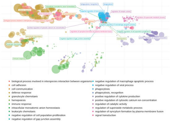 Human genome pathways upregulated in huNSG-DKO + LV in comparison to huNSG-DKO mice. Humanized NSG-DKO mice show the activation of several immune (immune response, defense response, and myeloid leukocyte activation) pathways after LV delivery. The sizes of the bubbles represent their relevance.