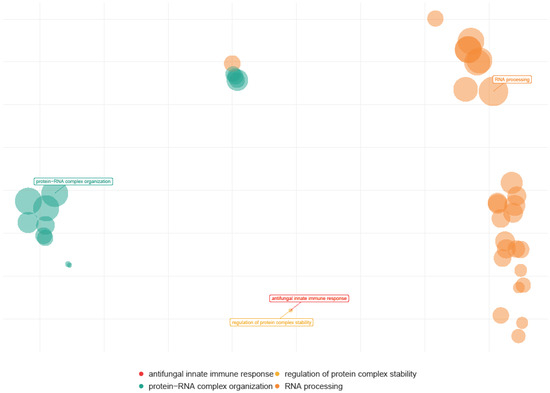 Mouse genome pathways upregulated in huNSG-DKO + LV in comparison to huNSG-DKO mice. LV delivery upregulates RNA-processing pathways within a mouse. The sizes of the bubbles represent their relevance.