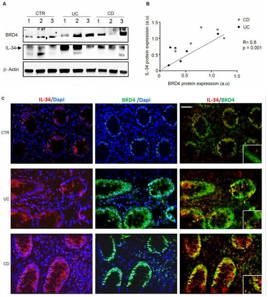 This study aimed to assess whether BRD4 is a regulator of IL-34 production in IBD. Specifically, we assessed whether, in human IBD samples, the expression of BRD4 correlates with IL-34 content; analyzed which cells co-express the two molecules; and whether the knockdown of BRD4 in IBD LPMC is followed by a reduction in IL-34 production.
