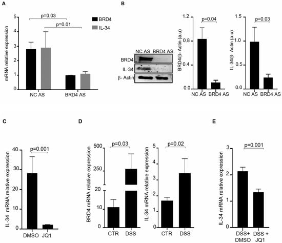 Bromodomain-containing 4 (BRD4) is a member of the bromodomain and extra terminal domain (BET) family which binds acetylated lysine residues in both histone and non-histone proteins and controls genome activity [14,15]. BRD4 is over-expressed in the inflamed mucosal areas of patients with CD and patients with UC [16], and its down-regulation with a specific antisense oligonucleotide (AS) in IBD LPMC reduces the synthesis of TNF-α, IL-17A, and IFN-γ [16]. Moreover, a pharmacological blockade of BET proteins attenuates cytokine production and mucosal inflammation in murine models of IBD [16]. BRD4 is also a critical regulator of cancer cell growth and survival, and studies in ovarian cancer cells have recently shown that BRD4 binds the promotor region of the IL-34 gene and regulates IL-34 production [17]. It has also been shown that the co-culture of hepatoblastoma cells with macrophages induced IL-34 overexpression in cancer cells via BRD4 signaling, further supporting the role of BRD4 in the control of IL-34 expression [18].