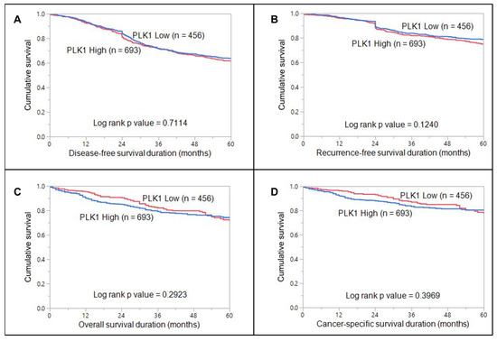 Survival curves for PLK1 in CRC. Kaplan–Meier survival curve showing no significant difference in (A) disease-free survival (p = 0.7114), (B) recurrence-free survival (p = 0.1240), (C) overall survival (p = 0.2923), and (D) cancer-specific survival (p = 0.3969) were compared between cases with high PLK1 expression and cases with low PLK1 expression.