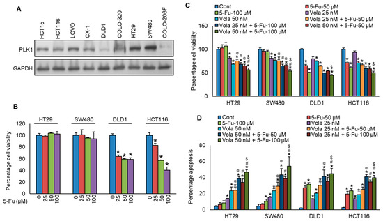We found that PLK1 protein expression in our cohort of CRC patients is significantly correlated with aggressive clinicopathological features. This prompted us to explore whether inhibition in PLK1 protein expression in CRC cell lines could reverse chemoresistance. For the in vitro functional studies, initially, we selected two specific CRC cell lines (HT29 and SW480) exhibiting resistance to 5-Fu with high PLK1 expression, along with two other cell lines (DLD1 and HCT116) that were sensitive to 5-Fu with low expressions for PLK1 (Figure 3A,B). Next, we treated these cells with a PLK1-specific inhibitor, volasertib, with and without 5-Fu for 48 h and evaluated the cells for viability and apoptosis. As displayed in Figure 3C,D, inhibition in PLK1 by volasertib significantly increased the chemosensitivity to 5-Fu in both HT29 and SW480 cell lines.