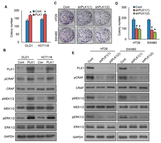 Inhibition of PLK1 reduces colorectal cancer cell growth by targeting the CRAF-MEK-ERK signaling pathway. (A) Overexpression of PLK1 increases clonogenicity. The PLK1 overexpressing clones of CRC cells were subjected to clonogenicity assay (n = 3). (B) Forced expression of PLK1 activates CRAF-MEK-ERK signaling pathway. The proteins from the PLK1-overexpressing clones were analyzed using immunoblotting. (C,D) Knockdown of PLK1 decreases clonogenicity. CRC cells were transfected with two different shRNA sequences targeting PLK1, and the PLK1 stable knockdown clones of CRC cells were subjected to clonogenicity assay (n = 3). (E) Knockdown of PLK1 leads to a decrease in the phosphorylation levels of CRAF, MEK1/2, and ERK1/2 proteins. * statistically significant in comparison to the control group, with p < 0.05.