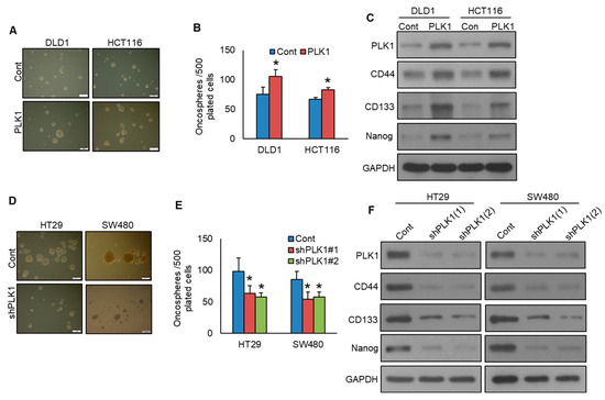 PLK1 exerts a pivotal role in sustaining the characteristics of cancer stemness [29]. To investigate the function of PLK1 in spheroid development and stemness in CRC, we generated PLK1-overexpressing CRC cell lines and grew them in spheroid growth medium. Intriguingly, enforced PLK1 expression in DLD1 and HCT116 cell lines led to enhanced spheroid growth (Figure 6A,B) and an elevated expression of CD133, CD44, and NANOG, compared to empty vector control cells (Figure 6C). Conversely, knockdown of PLK1 resulted in a substantial decrease in spheroid growth (Figure 6D,E) and a decrease in the expression of stem cell markers, including CD133, CD44, and NANOG (Figure 6F).