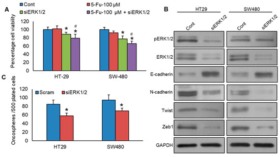 Knockdown of ERK1/2 reverses chemoresistance, EMT, and stemness in colorectal cancer cells. (A) Knockdown of ERK1/2 enhances the 5-Fu-induced decrease in cell viability. ERK1/2 knockdown cells were subjected to treatment with or without 5-Fu for a duration of 48 h, and cell viability was determined using the MTT assay (n = 8). (B) Knockdown of ERK1/2 leads to a decrease in the expression levels of EMT markers in CRC cells. The proteins were isolated from ERK1/2 knockdown CRC cells and were later analyzed using immunoblotting. (C) Knockdown of ERK1/2 reduces spheroid growth (n = 3). The ERK1/2 knockdown cells grew in a sphere-forming medium, and the total number of spheroids per well was quantified. * statistically significant in comparison to the control group, with p < 0.05. # compared to 5-Fu-100 µM.