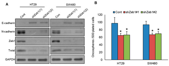 Knockdown of Zeb1 attenuates EMT and stemness. (A) Zeb1 knockdown led to a reduction in EMT marker expression in CRC cells. CRC cells were transfected with two different Zeb1 shRNA sequences, and the resulting protein levels in the selected clones were subsequently analyzed via immunoblotting. (B) Knockdown of Zeb1 reduces spheroid growth (n = 3). CRC clones with Zeb1 knockdown were grown in a specialized sphere-forming medium, and the number of spheroids formed (>50 μm) in each well was carefully counted. * statistically significant compared to control with p < 0.05.