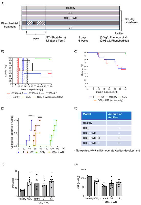 Development of portal hypertension and disease-dependent mortality. Schematic design of in vivo experiments in SD rats showing 5 groups of rats which were used. Besides healthy control rats, carbon tetrachloride (CCl4)-intoxicated rats and MASH rats (CCl4 + WD) without phenobarbital in their drinking water were used. Two groups of phenobarbital-treated rats were analyzed. One group with short-term (ST) and high-dose phenobarbital (0.3 g/L) treatment for 3 days and one group with long-term and low dose of phenobarbital (0.06 g/L) were used. CCl4 was intraperitoneally injected (i.p.) twice per week until ascites was present (A). Kapplan–Meier curve of all rat groups showing the survival of ST-treated rats during the first week, the second week and the third week in comparison to healthy, CCl4- and CCl4 + WD-treated rats (B). Survival curve of LT, ST (data pooled), healthy, CCl4 and CCl4 + WD rats (C). Cumulative incidence of ascites development in LT, ST, CCl4- and CCl4 + WD-treated animals in days (D). CCl4 + WD rats were not treated until the highest incidence of ascites to obtain a better comparison to phenobarbital-treated animals. Table of the models and the amount of ascites produced in the rat groups (E). Portal pressure (PP) of all rat groups (F). Mean arterial pressure (MAP) of all rat groups (G). Results are expressed as means + SEM; n = 5 per group. (*/** p < 0.05/p <0.001 vs. Healthy; #### p < 0.00001 vs. CCl4; ++ p < 0.005 vs. ST).