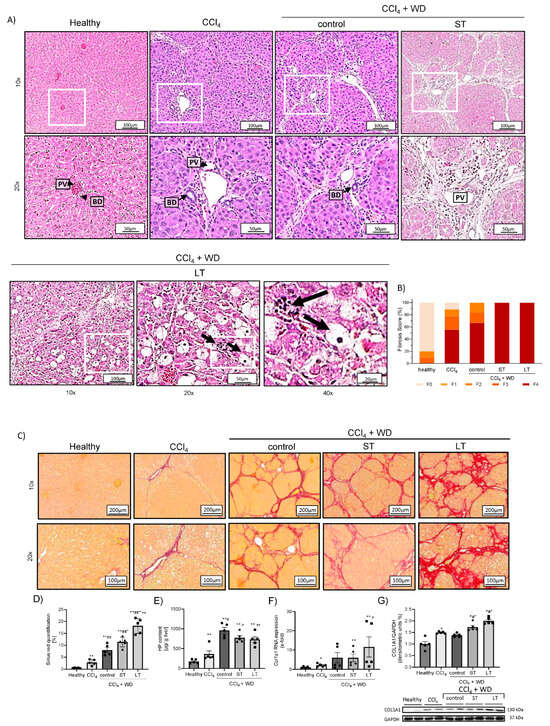 Hepatic collagen deposition was investigated by Sirius red (SR) staining in all rats. All treated animals showed the characteristic bridging fibrosis compared to healthy controls. Hepatic SR staining revealed increased collagen deposition after ST or LT treatment, as shown in the corresponding image and quantification (Figure 2C,D). This finding was confirmed by a significantly elevated HP content in liver samples of ST- and LT-treated rats compared to CCl4 alone (Figure 2E). However, there was no significant change in the hepatic HP content between CCl4 + WD rats without PB treatment and the ST- and LT-treated groups. The hepatic gene expression of Col1a1 was increased in all CCl4-treated groups compared to the healthy controls. LT treatment induced significantly higher Col1a1 expression levels compared to CCl4 alone (Figure 2F). The hepatic protein levels of Col1a1 were also significantly increased in the ST and LT groups compared to the healthy controls (Figure 2G).
