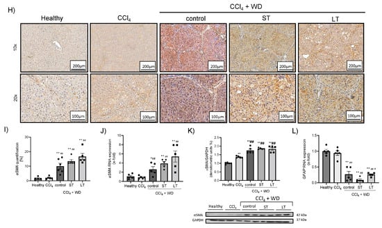 To examine hepatic stellate cells (HSC)’s activation, αSMA staining and gene and protein levels were analyzed. After ST and LT treatment, αSMA deposition was increased compared to the healthy and CCl4-intoxicated animals (Figure 2H–K). This was confirmed by decreased Gfap mRNA expression, a marker for quiescent HSCs, in ST and LT livers (Figure 2L). Furthermore, the lowest Gfap gene expression was observed in the ST-treated animals, which further supports the strong and acute toxic effect of high-dose ST treatment compared to LT and CCl4 + WD treatment (Figure 2L). Nevertheless, the αSMA protein expression levels were not changed after ST or LT treatment compared to the control rats (CCl4 + WD without Phenobarbital) (Figure 2K). Overall, these results demonstrate that ST and LT treatment significantly increases HSC activation and hepatic collagen deposition.