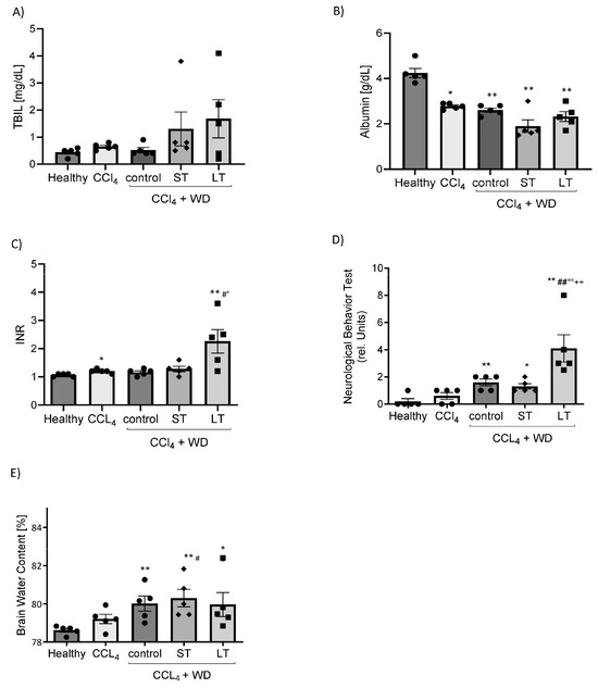 The combination of CCl4 and WD with LT and ST treatment induces extrahepatic complications, as shown by the neurological behavior test. We could observe major neurological impairment, especially in LT-treated animals, as shown by the neurological behavior test. Nevertheless, a minor influence of PB on neurological behavior, even after treatment cessation for 7 days, cannot be excluded. Therefore, we measured the brain water content and could observe that the control rats (CCl4 and WD) and the ST and LT animals had a significant increase in their brain water content, suggesting a brain edema and, subsequently, hepatic encephalopathy as the cause of the impaired neurological behavior [,].