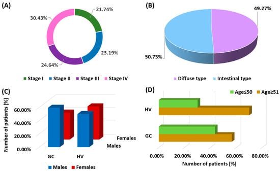 Graphical representation of the characteristics of GC patients and healthy volunteers included in the study. (A) illustrates the distribution of GC patients by disease stage at diagnosis; (B) shows the division of patients by histopathological type of GC: intestinal type and diffuse type; (C) presents the gender distribution in both the GC patient group and the healthy control group; and (D) shows the age diversity of the recruited GC patients and healthy volunteers, showing the full age range of the study subjects. Abbreviations: GC, gastric cancer; HV, healthy volunteers.