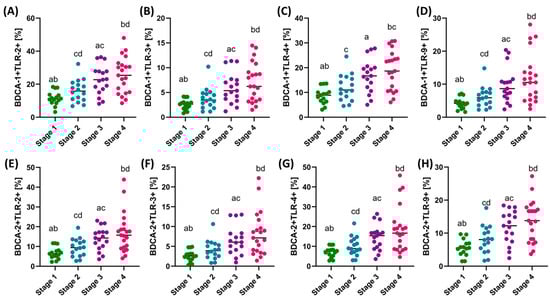 Comparison of the obtained results of the assessment of the percentage of the studied TLRs on dendritic cell subpopulations between patients in the individual stages of the disease. (A–D) Analysis of the percentage of TLR-2, TLR-3, TLR-4, and TLR-9 on BDCA-1 dendritic cells; (E–H) Analysis of the percentage of TLR-2, TLR-3, TLR-4, and TLR-9 on BDCA-2 dendritic cells. Statistically significant differences between the individual stages are marked with letters. To facilitate interpretation, the appropriate GC stages are marked with individual colors (green—stage I; blue—stage II; purple—stage III; pink—stage IV).