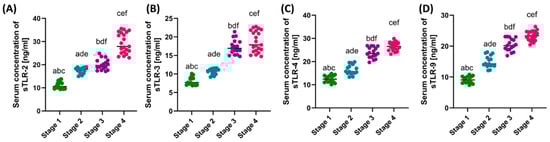 Comparison of the obtained results of the concentration of soluble forms of the studied TLRs in serum between patients in individual stages of the disease. (A–D) Analysis of serum concentrations of sTLR-2, sTLR-3, sTLR-4, and sTLR-9. Statistically significant differences between individual stages are marked with letters. To facilitate interpretation, the appropriate GC stages are marked with individual colors (green—stage I; blue—stage II; purple—stage III; pink—stage IV).