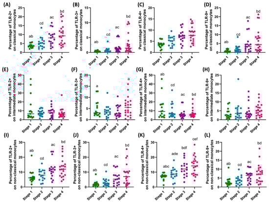 Comparison of the obtained results of the assessment of the percentage of the studied TLRs on monocyte subpopulations between patients in the individual stages of the disease. (A–D) Analysis of the percentage of TLR-2, TLR-3, TLR-4, and TLR-9 on classical monocytes; (E–H) Analysis of the percentage of TLR-2, TLR-3, TLR-4, and TLR-9 on intermediate monocytes; (I–L) Analysis of the percentage of TLR-2, TLR-3, TLR-4, and TLR-9 on non-classical monocytes. Statistically significant differences between individual stages are marked with letters. To facilitate interpretation, the appropriate GC stages are marked with individual colors (green—stage I; blue—stage II; purple—stage III; pink—stage IV).