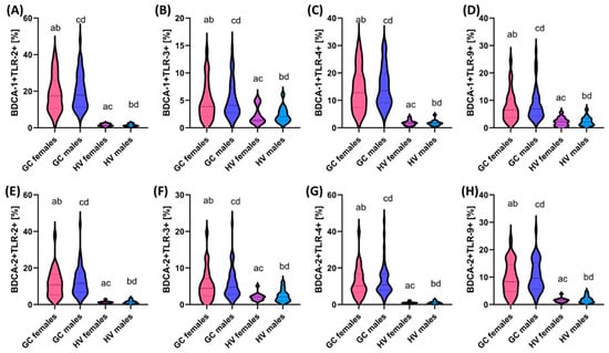 Comparison of the obtained results of the assessment of the percentage of the studied TLRs on dendritic cell subpopulations between patients depending on the patient’s gender. (A–D) Analysis of the percentage of TLR-2, TLR-3, TLR-4, and TLR-9 on BDCA-1 DCs; (E–H) Analysis of the percentage of TLR-2, TLR-3, TLR-4, and TLR-9 on BDCA-2 dendritic cells. Statistically significant differences between individual stages are marked with letters. To facilitate interpretation, the respective sexes are marked with individual colors (pink—women with GC; navy blue—men with GC; purple—women HV; light blue—men HV).