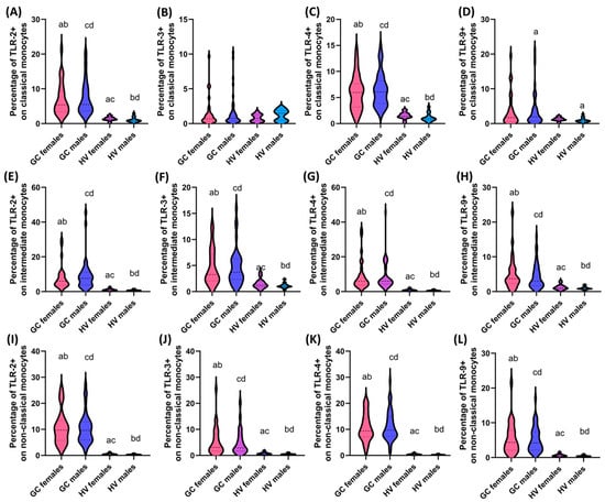 Comparison of the obtained results of the assessment of the percentage of the studied TLRs on monocyte subpopulations between patients depending on the patient’s gender. (A–D) Analysis of the percentage of TLR-2, TLR-3, TLR-4, and TLR-9 on classical monocytes; (E–H Analysis of the percentage of TLR-2, TLR-3, TLR-4, and TLR-9 on intermediate monocytes; (I–L) Analysis of the percentage of TLR-2, TLR-3, TLR-4, and TLR-9 on non-classical monocytes. Statistically significant differences between individual stages are marked with letters. To facilitate interpretation, the respective genders are marked with individual colors (pink—women with GC; navy blue—men with GC; purple—women HV; light blue—men HV).