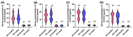 Comparison of the obtained results of the concentration of soluble forms of the studied TLRs in serum between patients, taking into account differences in gender. (A–D) Analysis of serum concentrations of sTLR-2, sTLR-3, sTLR-4, and sTLR-9. Statistically significant differences between individual stages are marked with letters. To facilitate interpretation, individual colors indicate the appropriate genders (pink—women with GC; navy blue—men with GC; purple—women HV; light blue—men HV).