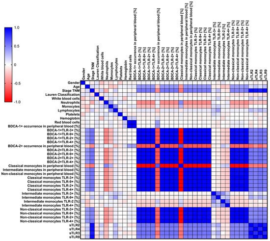 Schematic representation of the Spearman rank correlation of the studied parameters in patients with newly diagnosed GC. For ease of interpretation, negative correlations are marked in red, while positive correlations are marked in blue. The intensity of the coloring of individual pairs indicates the strength of correlations.