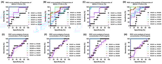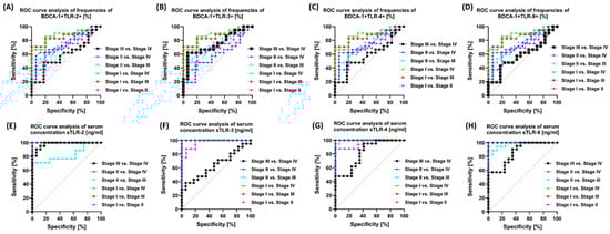 Graphical representation of selected ROC curves depending on the disease stage in GC patients. (A–D) ROC curves presenting a comparison of the sensitivity and specificity of the tested TLRs on BDCA-1; (E–H) ROC curves presenting a comparison of the sensitivity and specificity of the tested concentrations of soluble forms of TLRs in the serum of patients.