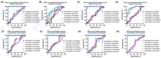 Graphical representation of selected ROC curves depending on the sex of recruited patients. (A–D) ROC curves presenting a comparison of sensitivity and specificity of the tested TLRs on BDCA-1; (E–H) ROC curves presenting a comparison of sensitivity and specificity of the tested concentrations of soluble forms of TLRs in the serum of patients.