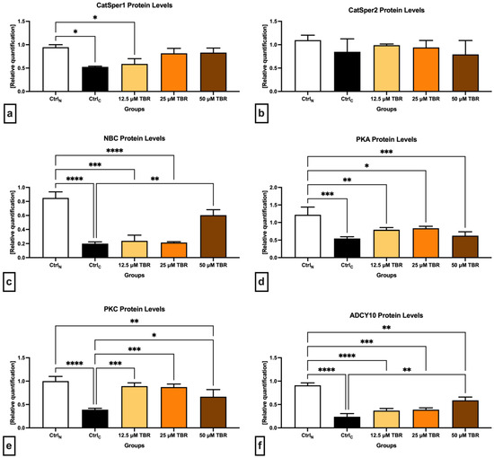 Similar to PKA, the lowest levels of the PKC protein were found in the cryopreserved control; they were significantly decreased in comparison to CtrlN (p < 0.0001) (Figure 2e). In the meantime, the administration of all TBR doses prevented the loss of the PKC protein in comparison to CtrlC (p < 0.001 in the case of 12.5 µM TBR and 25 µM TBR; and p < 0.05 concerning 50 µM TBR).