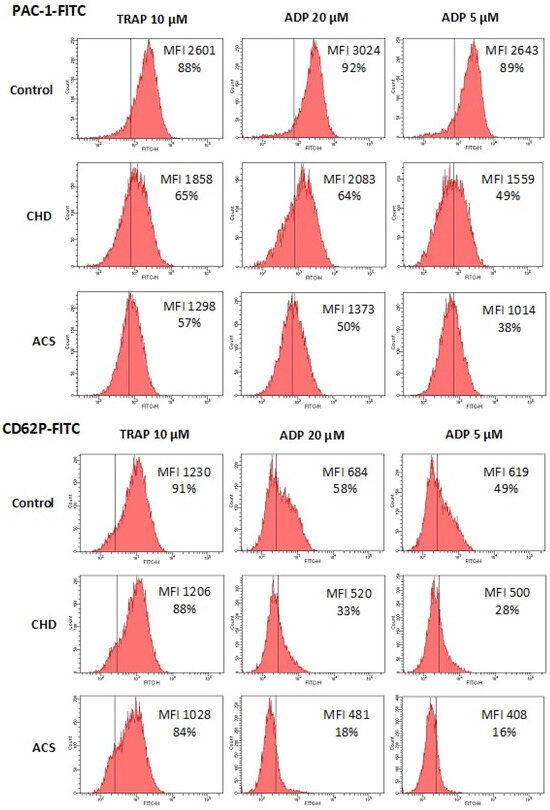 Platelet activity in the control (no antiplatelet drugs), CHD (ASA + clopidogrel), and ACS (ASA + ticagrelor) groups. Flow cytometry. X-axis—“Count”, Y-axis—“FITC” fluorescence. Exposure of activated GP IIb-IIIa determined by PAC-1-FITC binding (upper panel) and exposure of P-selectin determined by CD62P-FITC binding (lower panel). Platelets were activated by TRAP 10 µM, and ADP 20 and 5 µM. Vertical line: negative control level (95% threshold in samples with no agonists). MFI and % of PAC-1+ and CD62P+ platelets are shown. X-axis—“Count”, Y-axis—“FITC-H” fluorescence. Representative examples.