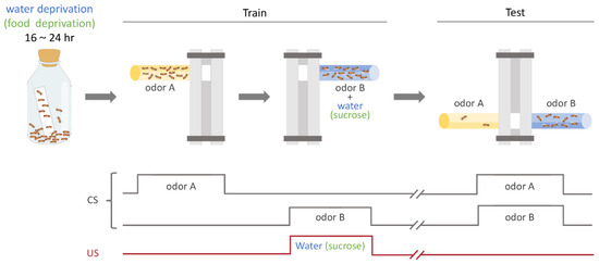 Typically, this conditioning procedure entails exposing groups of flies to two distinct odors, a CS+ and a CS−, with only the CS+ being presented concurrently with the US. Numerous studies have described the appetitive olfactory conditioning paradigms extensively [37,38,39]. Herein, we illustrate an associative water- (or sucrose-) reward paradigm, in which water (or sucrose) serves as a form of reinforcement (Figure 1). Prior to conditioning, the flies were subjected to a period of water or food deprivation lasting between 16 and 24 h while housed in glass milk bottles containing filter paper with dried sucrose or water-soaked filter paper. The training tube in the teaching machine, called the T-maze, served as the positive conditioned stimulus (CS+) and further contained filter paper soaked with water (or sucrose). The conditioning procedure involved placing approximately 50–75 thirsty (or hungry) flies in the elevator section of a T-maze. Initially, the flies were moved to the CS− tube, where an odor was presented for 2 min without water (or sucrose) reinforcement. Subsequently, following a 1 min interval of exposure to clean air, the flies were returned to the elevator and directed to the CS+ tube, which contained water (or sucrose) reinforcement as well as a different odor, for another 2 min period. Memory was assessed at specified intervals following the training session by presenting the flies with a selection between two distinct odors. Flies that effectively formed memories opted for the CS+ odor. The performance index (PI) was determined by subtracting the number of flies in the CS− tube from the number in the CS+ tube, and then dividing this difference by the total number of flies. The flies were individually transferred from each tube into vials and immobilized by freezing to allow accurate counting. To minimize any potential bias related to odor perception, a single PI was derived from the average scores of two distinct experiments. In these experiments, separate cohorts of flies with identical genotypes were conditioned with different combinations of 4-methylcyclohexanol (MCH) and 3-octanol (OCT) odors as the CS+ and CS− stimuli.