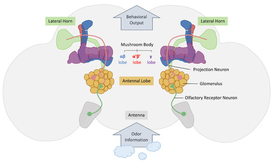 Olfactory information related to the conditioned stimulus is transmitted to mushroom bodies (MB) by neurons located upstream of the olfactory nervous system. The olfactory nervous system of Drosophila melanogaster exhibits a high degree of structural and functional similarity to that in vertebrates, indicating that the fundamental principles elucidated in this context are likely applicable across different animal phyla [62]. Within the olfactory system of Drosophila, the neural pathway responsible for conveying olfactory information from the antennal lobes to the MB has been extensively characterized [63].