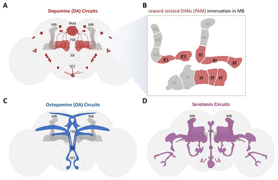 Illustration of the various reward circuits identified in adult Drosophila. The identified circuits associated with behavioral responses to rewards encompassed (A) dopaminergic circuits; (B) the innervation of DANs (PAM) within the MB involved in synaptic connections related to reward across different MB compartments; (C) octopaminergic circuits; and (D) serotoninergic circuits. (MB: mushroom body; PAM: protocerebral anterior medial; FSB: fan-shaped body; EB: ellipsoid body; SEZ: subesophageal zone).