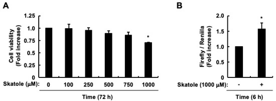 Impact of skatole on intestinal epithelial Caco-2 cells: assessment of cell viability and TNF-α promoter activity. (A) Cell viability. Data represent the mean ± SE of quadruplicates from n = 3. * p < 0.05 vs. vehicle (DMSO). (B) TNF-α promoter activity. Data represent the mean ± SE of duplicates from n = 3. * p < 0.05 vs. vehicle (DMSO).