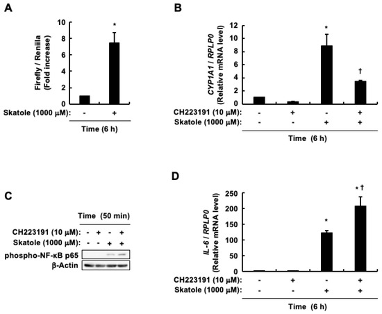 Impact of AhR on the NF-κB phosphorylation and IL-6 mRNA expression triggered by skatole in intestinal epithelial Caco-2 cells. (A) AhR transcriptional activity. Data represent the mean ± SE of duplicates from n = 3. * p < 0.05 vs. vehicle (DMSO). (B) CYP1A1 mRNA expression. Data are expressed as the mean ± SE of n = 3. * p < 0.05 vs. vehicle (DMSO). † p < 0.05 vs. skatole alone. (C) Phospho-NF-κB p65 (Ser276) and β-actin. (D) IL-6 mRNA expression. Data are expressed as the mean ± SE of n = 3. * p < 0.05 vs. vehicle (DMSO). † p < 0.05 vs. skatole alone.
