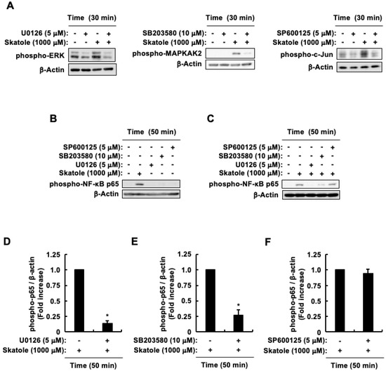 Impact of MAPKs on NF-κB activation triggered by skatole in intestinal epithelial Caco-2 cells. (A) Phospho-ERK, phospho-MAPKAPK2, phospho-c-Jun, and β-actin. (B,C) Phospho-NF-κB p65 (Ser276) and β-actin. Effect of U0126 (D), SB203580 (E), and SP600125 (F) on phosphorylation levels of phospho-NF-κB p65 (Ser276). Band intensity of phospho-NF-κB p65 (Ser276) normalized to β-actin. Data are expressed as the mean ± SE of n = 3. * p < 0.05 vs. skatole alone.