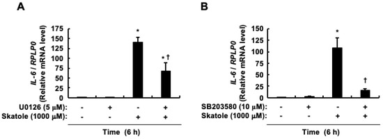 Impact of ERK and p38 on IL-6 mRNA expression induced by skatole in intestinal epithelial Caco-2 cells. Effect of U0126 (A) and SB203580 (B) on IL-6 mRNA expression. Data are expressed as the mean ± SE of n = 3. * p < 0.05 vs. vehicle (DMSO). † p < 0.05 vs. skatole alone.
