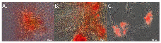 Cultured MSCs stimulated towards (A) chondrogenesis, (B) osteogenesis, (C) adipogenesis, all stained with safranin-O, alizarin red, and oil red O, respectively, on day 21 of culture.