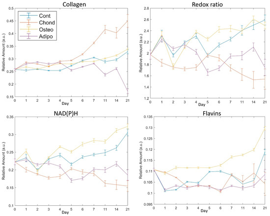 An advantage of this technology is that relatively low intensity light can be utilised, which does not damage the continuing viability of the cells [20]. As such, this study aims to investigate the changing profile of collagen, NAD(P)H, and flavins in continuous cultures of MSCs stimulated to undergo osteogenesis, adipogenesis, and chondrogenesis relative to control cells maintained in a normal growth medium over the course of 21 days.
