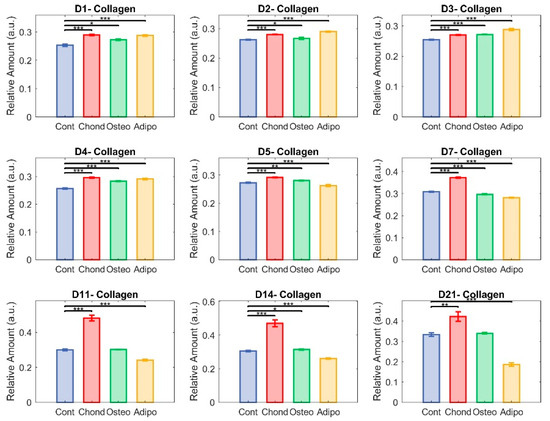Relative abundance of collagen was elevated for MSCs induced under chondrogenic differentiation conditions from 24 h (Figure 6, day 1). Unsurprisingly, this effect persisted through the whole period of culture (Figure 6), becoming increasingly exaggerated from day 7 and continuing until day 21. MSCs induced under osteogenic conditions displayed increased levels of collagen on days 1 to 7 as well as on day 14, but there were no differences in collagen levels on days 7, 11, and 21. Despite initial increases relative to control MSCs (Figure 6, days 1–4), MSCs induced under adipogenic conditions exhibited lower levels of collagen on days 5–14, with a drastic decrease on day 21 (Figure 6). Control MSCs cultured under non-differentiated, normal growth conditions became over confluent, an event associated with loss of pluripotency and spontaneous differentiation. Collagen levels held relatively stable in the early stages of the normal culture, but increased in the later periods, with the highest values observed on day 21 (Figure 5). This followed a similar trajectory to that of MSCs directed towards osteogenic differentiation (Figure 5).