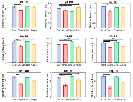 Redox ratio (RR). Each group—control (in blue), chondrocytes (in red), osteocytes (in green), and adipocytes (in yellow)—represent NAD(P)H relative abundance divided by flavin relative abundance in the cultured cells (* p < 0.05 and *** p < 0.001).
