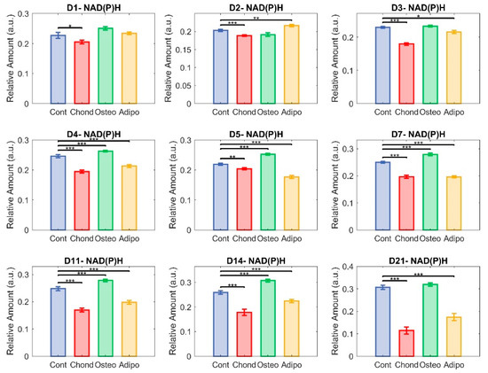 Unmixed NAD(P)H. Here, each group—control (in blue), chondrocytes (in red), osteocytes (in green), and adipocytes (in yellow)—is represented in terms of the relative abundance of NAD(P)H (* p < 0.05, ** p < 0.01, and *** p < 0.001).