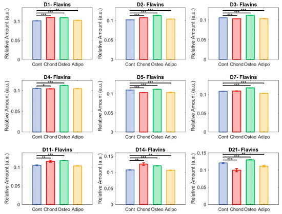 Unmixed flavins. Here, each group—control (in blue), chondrocytes (in red), osteocytes (in green), and adipocytes (in yellow)—is represented in terms of relative abundance of flavins (* p < 0.05, ** p < 0.01, and *** p < 0.001).