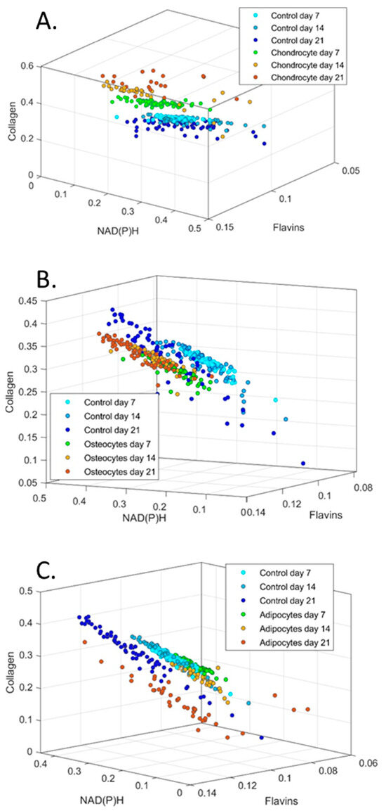Successful differentiation of osteocytes, chondrocytes, and adipocytes was confirmed by staining with the relevant marker (Figure 1) on day 21. Changes in the autofluorophore relative abundance over time are illustrated in Figure 5 and described in detail in the relevant subsections.